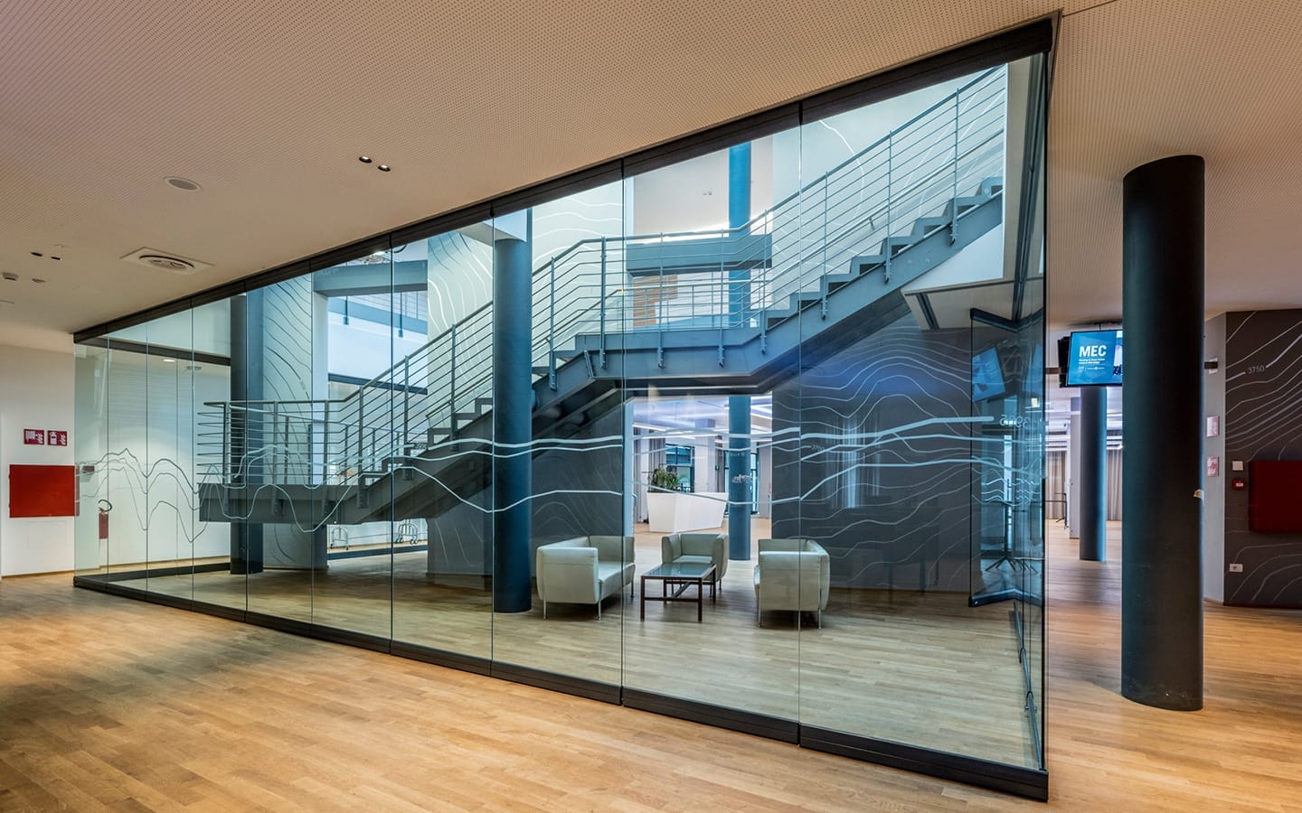 Eine 34 Meter lange Schiebewand mit anthrazitgrauen Aluminiumprofilen und einer zweiflügeligen Durchgangstür mit Panikriegel.